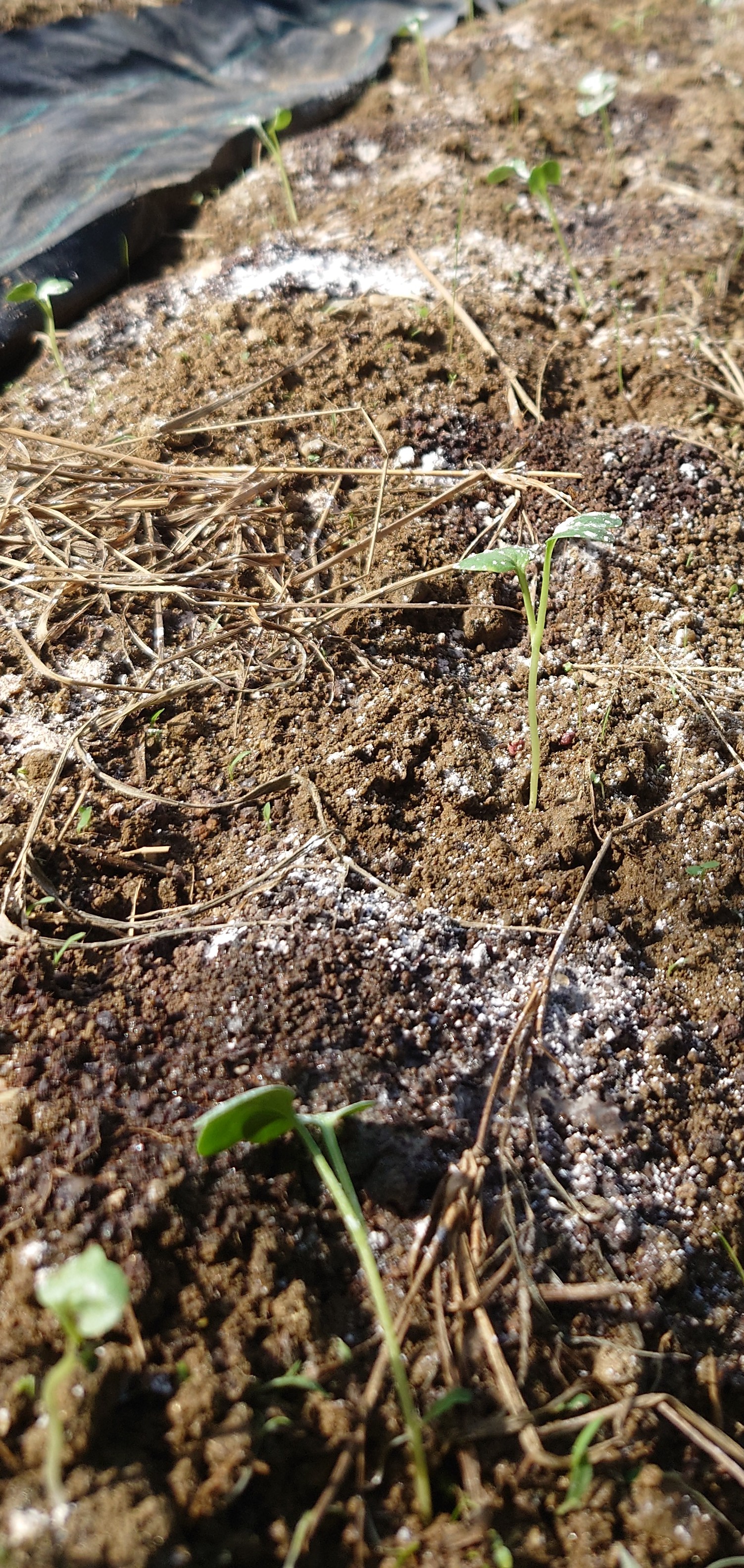 上に被せていた布を取り、葉っぱが食べられているものがあったので、お薬撒いて、間引きしました。