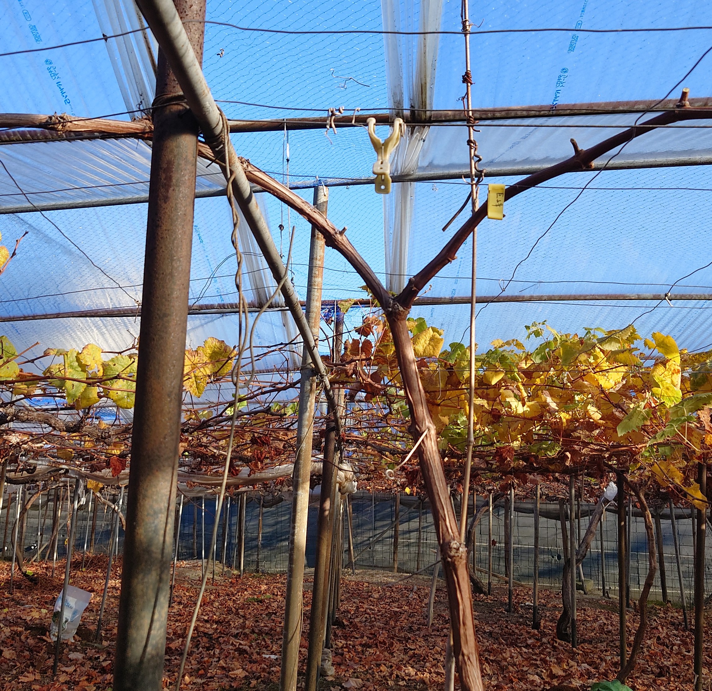 ただいま大粒ブドウの剪定中〜。これは3年前に植えた巨峰の木…