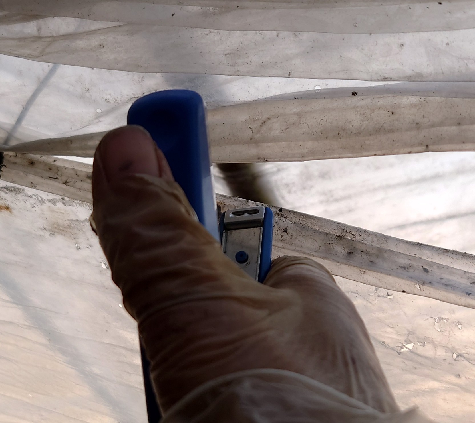 二重ハウスにするためにビニール同士をホッチキスでとめていきました。 ただいま大粒ブドウの剪定中〜。これは3年前に植えた巨峰の木…